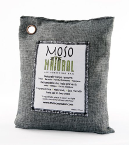 Moso air purifying bags, made of linen and filled with bamboo charcoal, absorb unpleasant odors and dehumidify the air. The porous structure of the high density bamboo charcoal helps remove bacteria, harmful pollutants and allergens from the air and absorbs moisture, preventing mold and mildew by trapping the impurities inside each pore. The Moso air purifying bag has been scientifically proven to reduce the amount of formaldehyde, ammonia, benzene, and chloroform gases emitted from everyday items such as paint, carpeting, furniture, air fresheners, chemical cleaners, rubber, and plastics. Toxin free, the bags are safe to use around pets and children. The bamboo charcoal rejuvenates when the bags are placed in sunlight once a month. You can reuse the bags for two years, after which the charcoal can be poured into the soil around plants to fertilize and help retain moisture. Charcoal gray colored bag filled with 200grams of bamboo charcoal. The 200gram size is perfect for bathrooms, closets, equipment baqs, lockers, hampers and laundry rooms or any area up to 90 square feet.